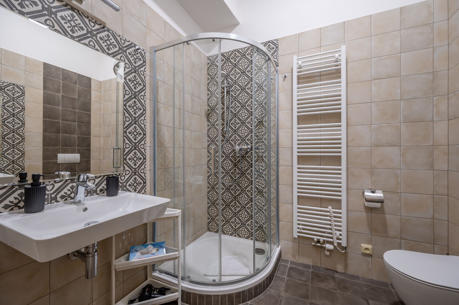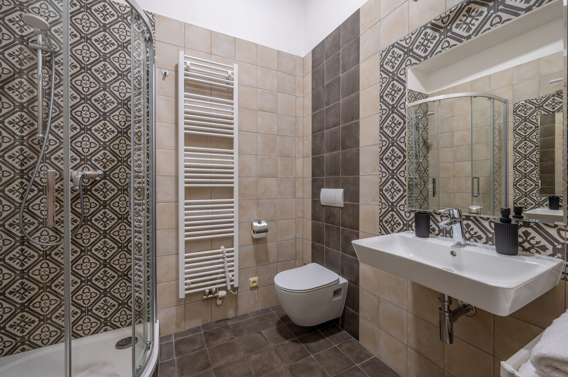 Vybavení koupelny: Sprchový kout, ručníky, šampón a sprchový gel, pračka