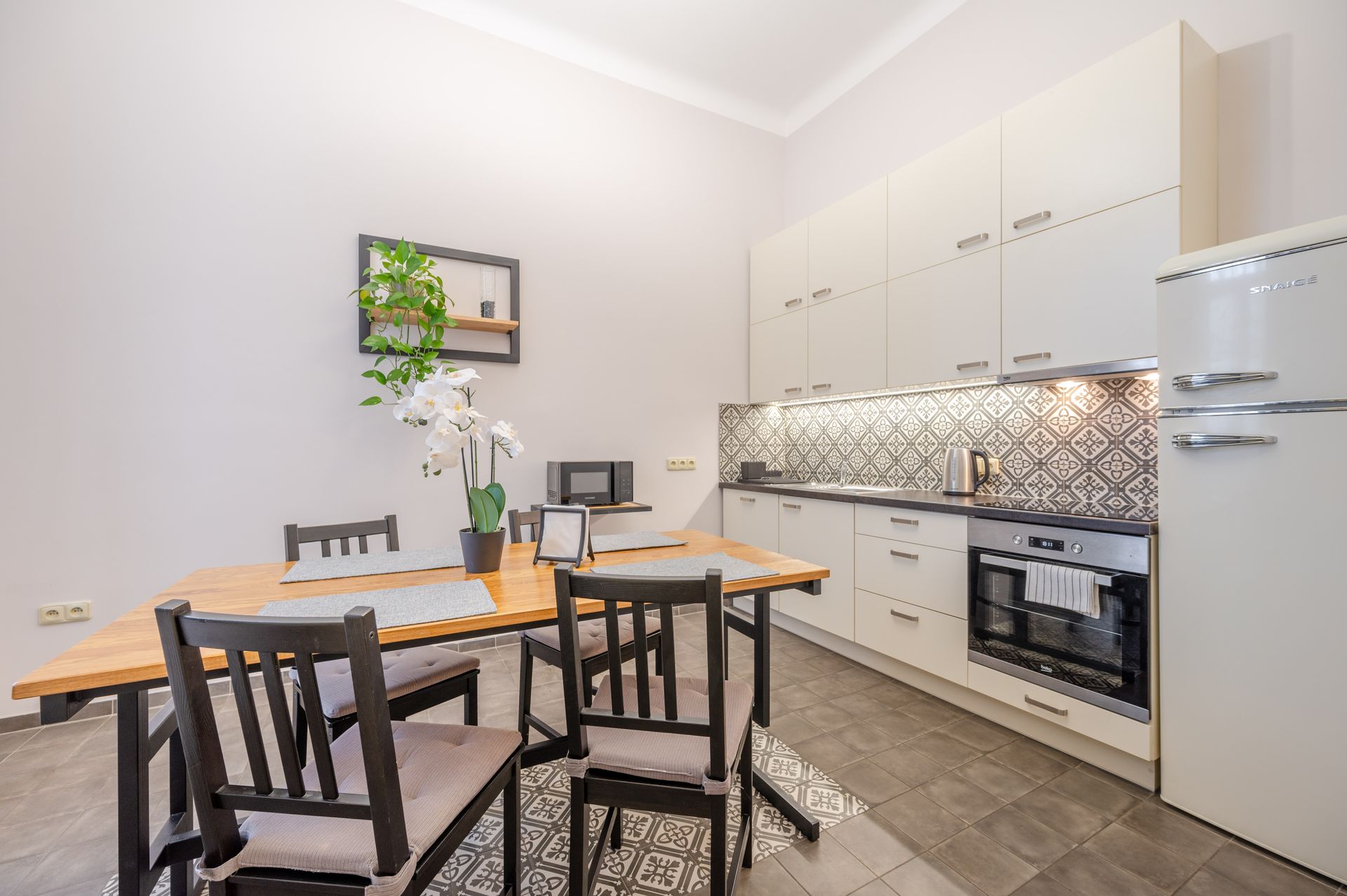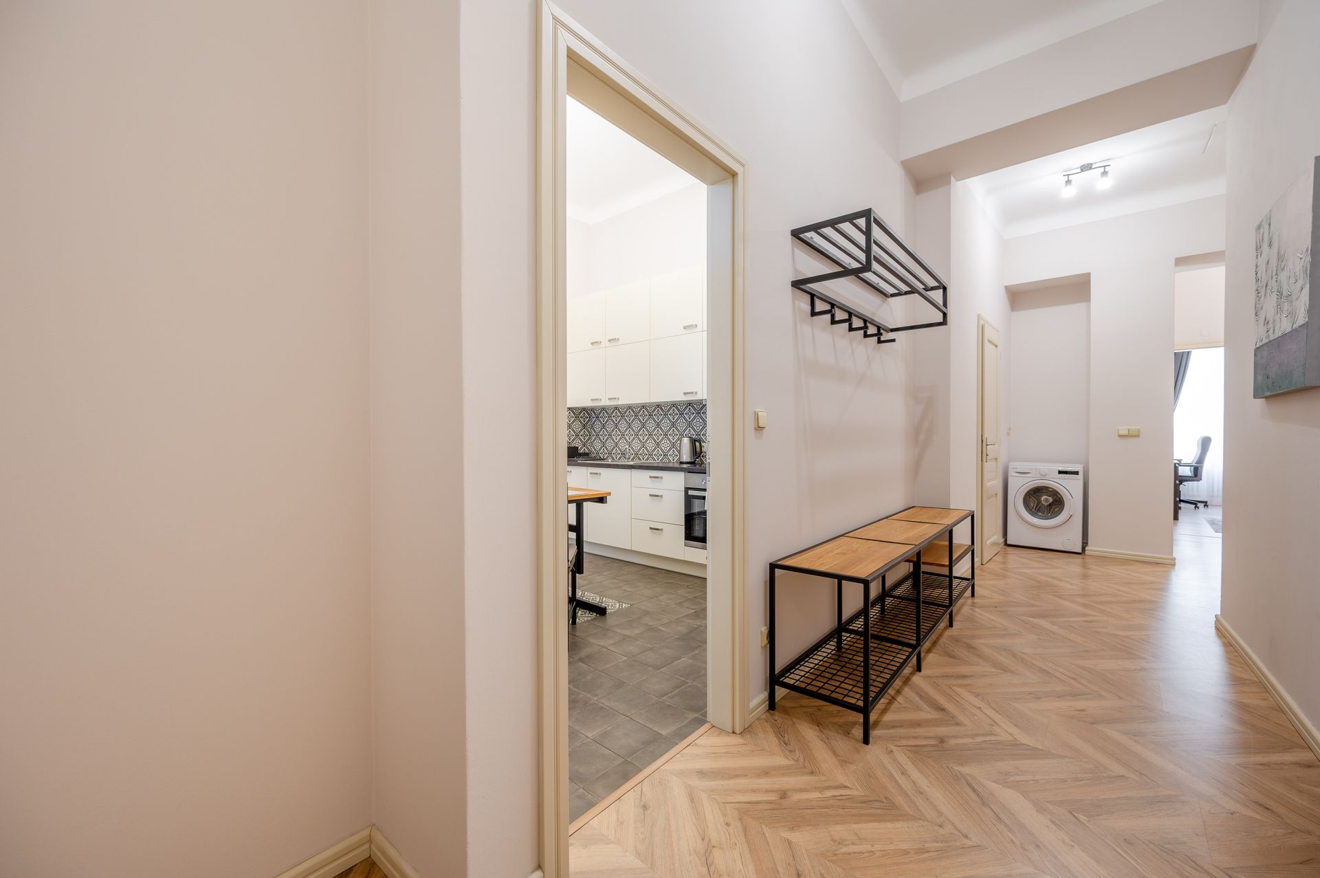 Prostorný apartmán se třemi ložnicemi, obývacím pokojem a moderní koupelnou. Plně vybavená kuchyň zahrnuje sporák, lednici, myčku a nádobí. K dispozici je také pračka, TV s plochou obrazovkou a koutek na čaj a kávu. Ideální pro komfortní pobyt.