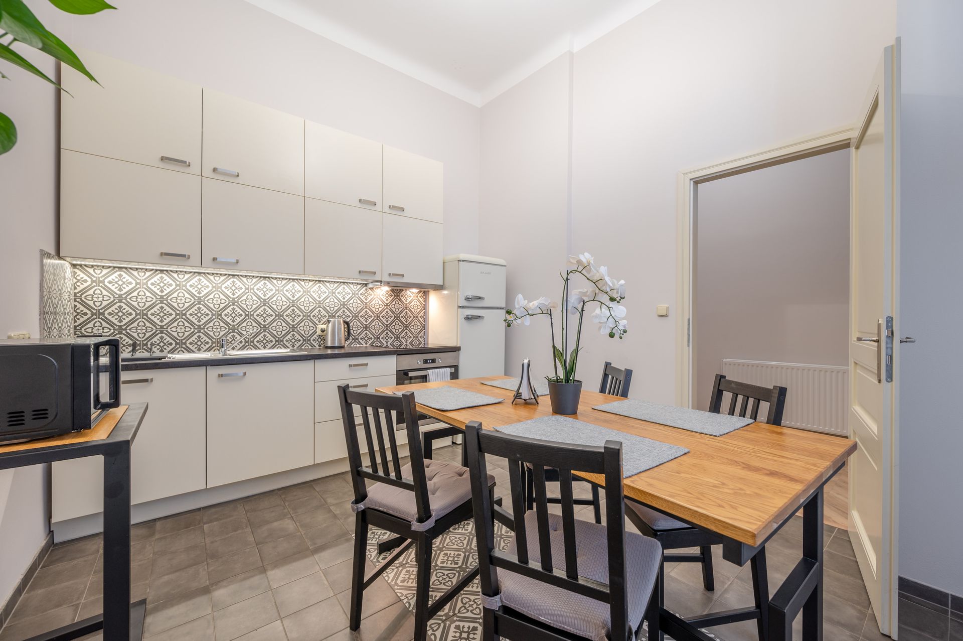 Kuchyň: Kuchyňský kout, rychlovarná konvice, nádobí, trouba, mikrovlnka, myčka nádobí, lednice s mrazákem