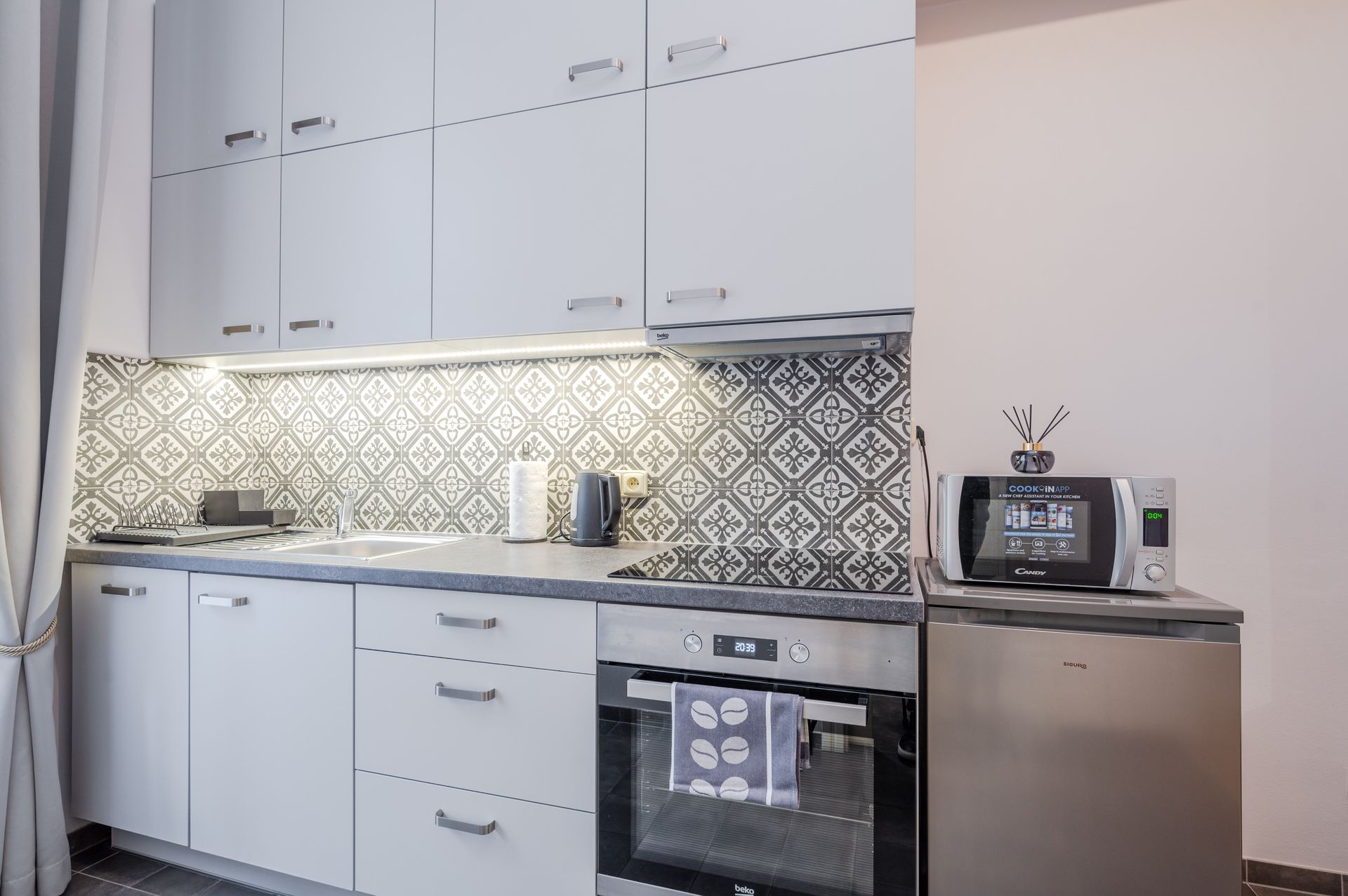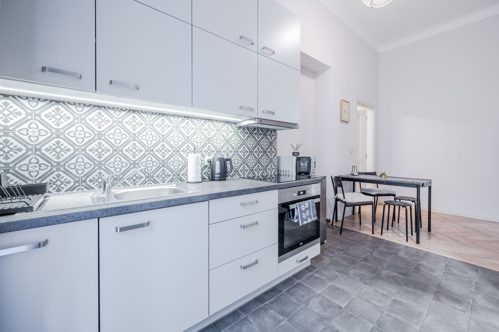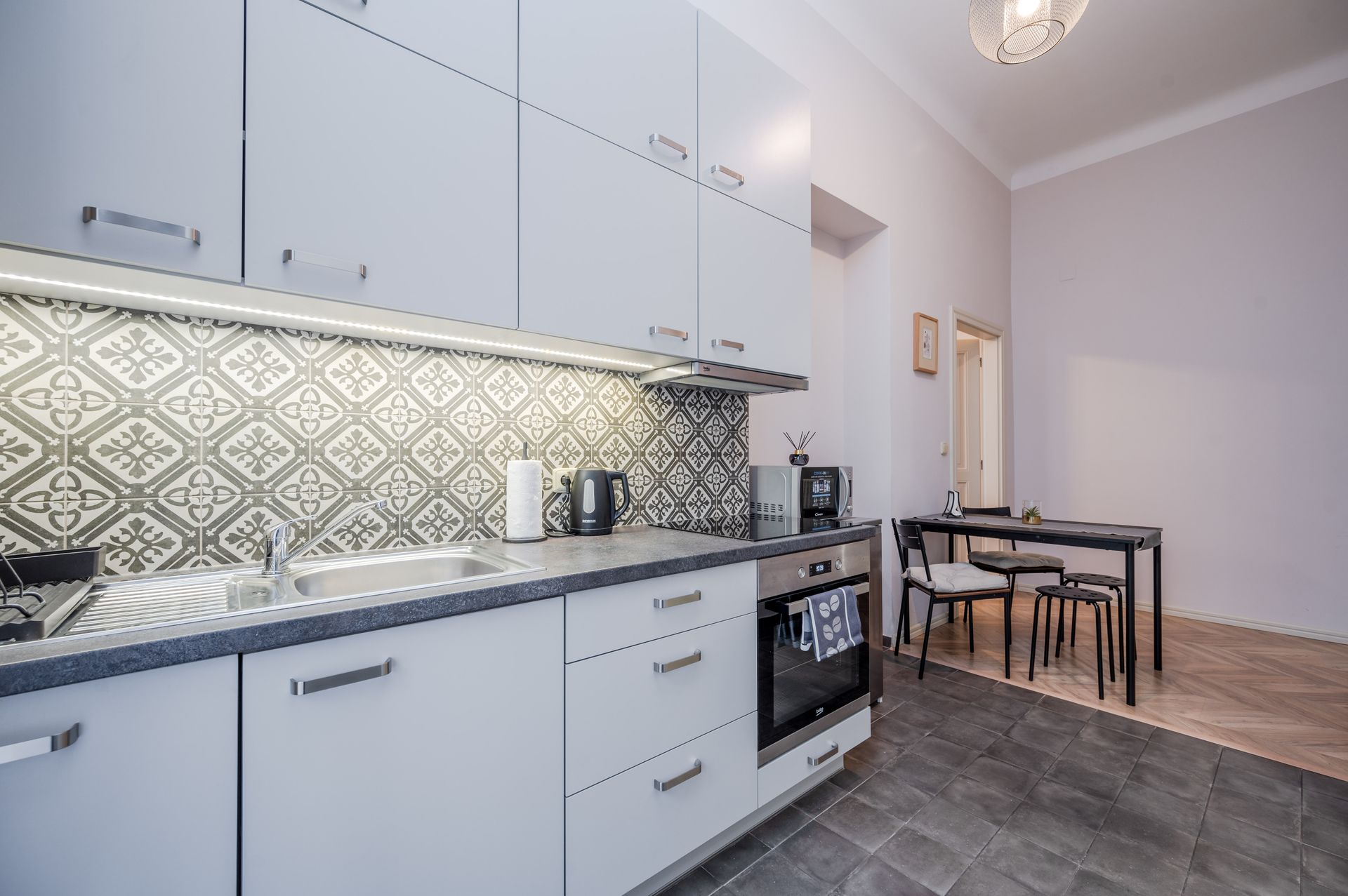 Kuchyň: Kuchyňský kout, rychlovarná konvice, nádobí, trouba, mikrovlnka, myčka nádobí, lednice s mrazákem