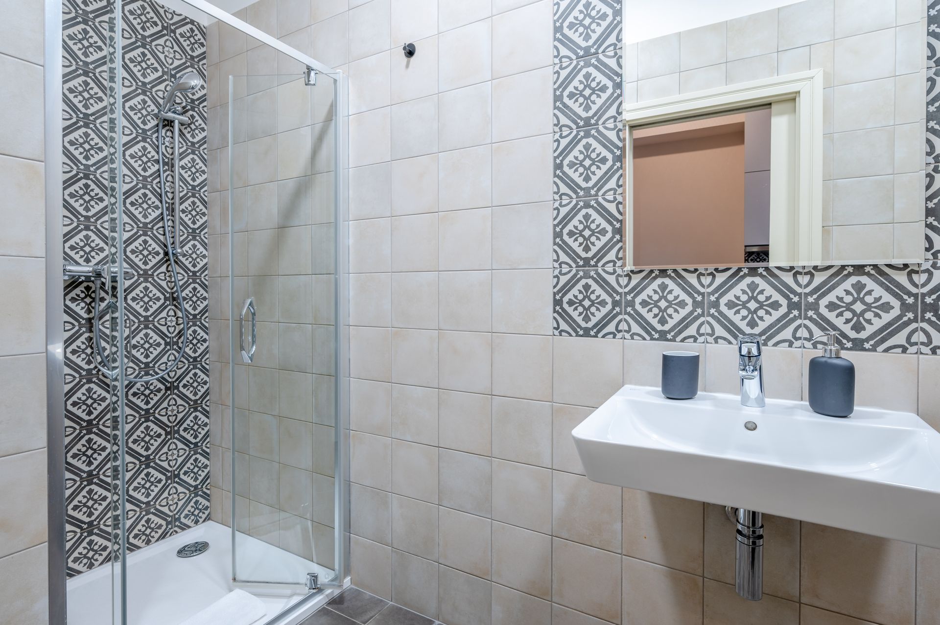 Vybavení koupelny: Sprchový kout, ručníky, šampón a sprchový gel
