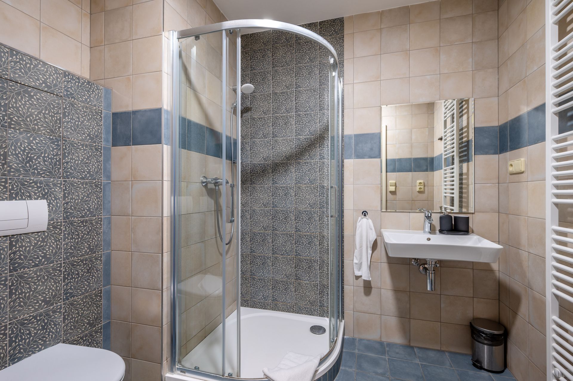 Vybavení koupelny: Sprchový kout, ručníky, šampón a sprchový gel