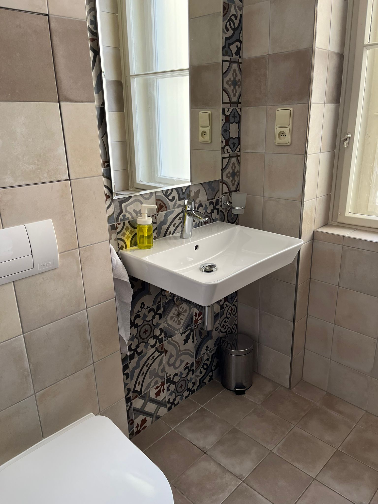 Výhled: malé okno (světlík) do vnitrobloku - tento pokoj nemá jiná vlastní okna