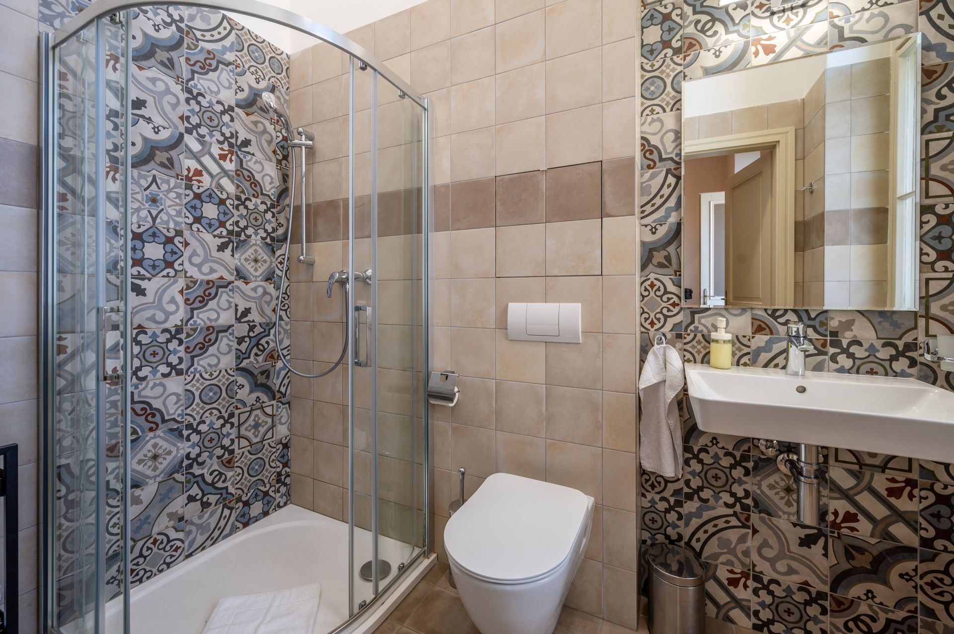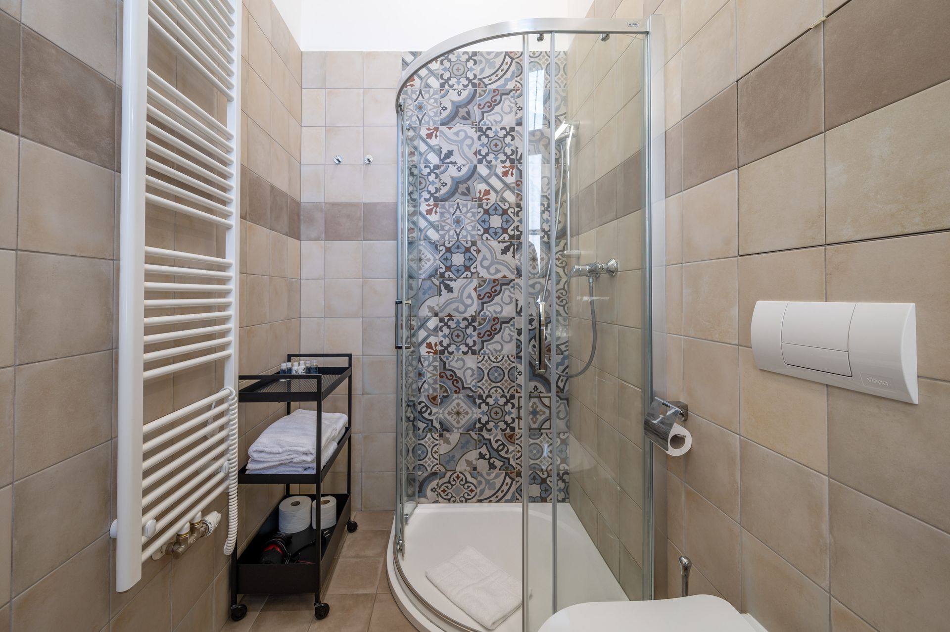 Vybavení koupelny: Sprchový kout, ručníky, šampón a sprchový gel