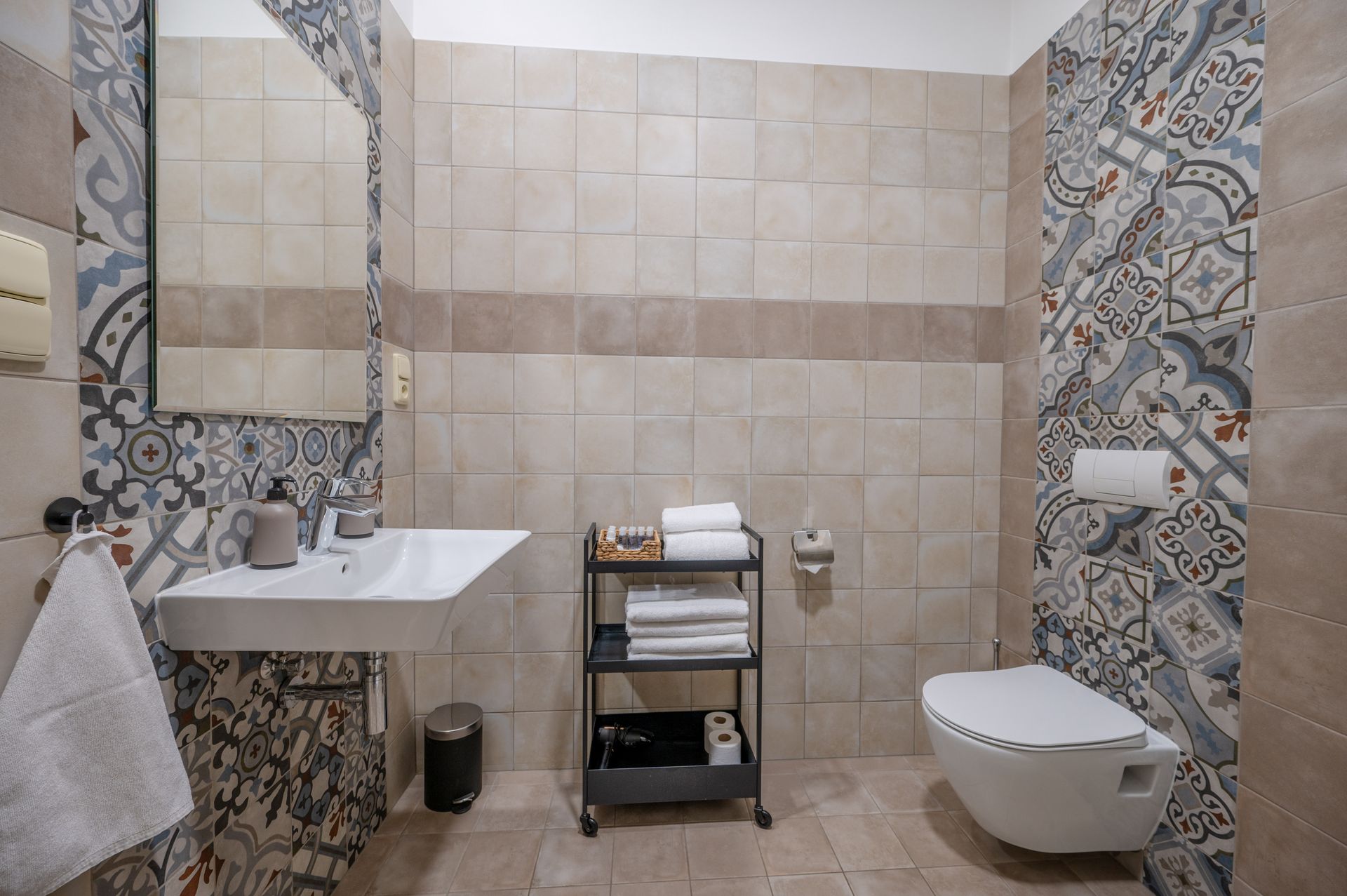 Vybavení koupelny: Sprchový kout, ručníky, šampón a sprchový gel, pračka