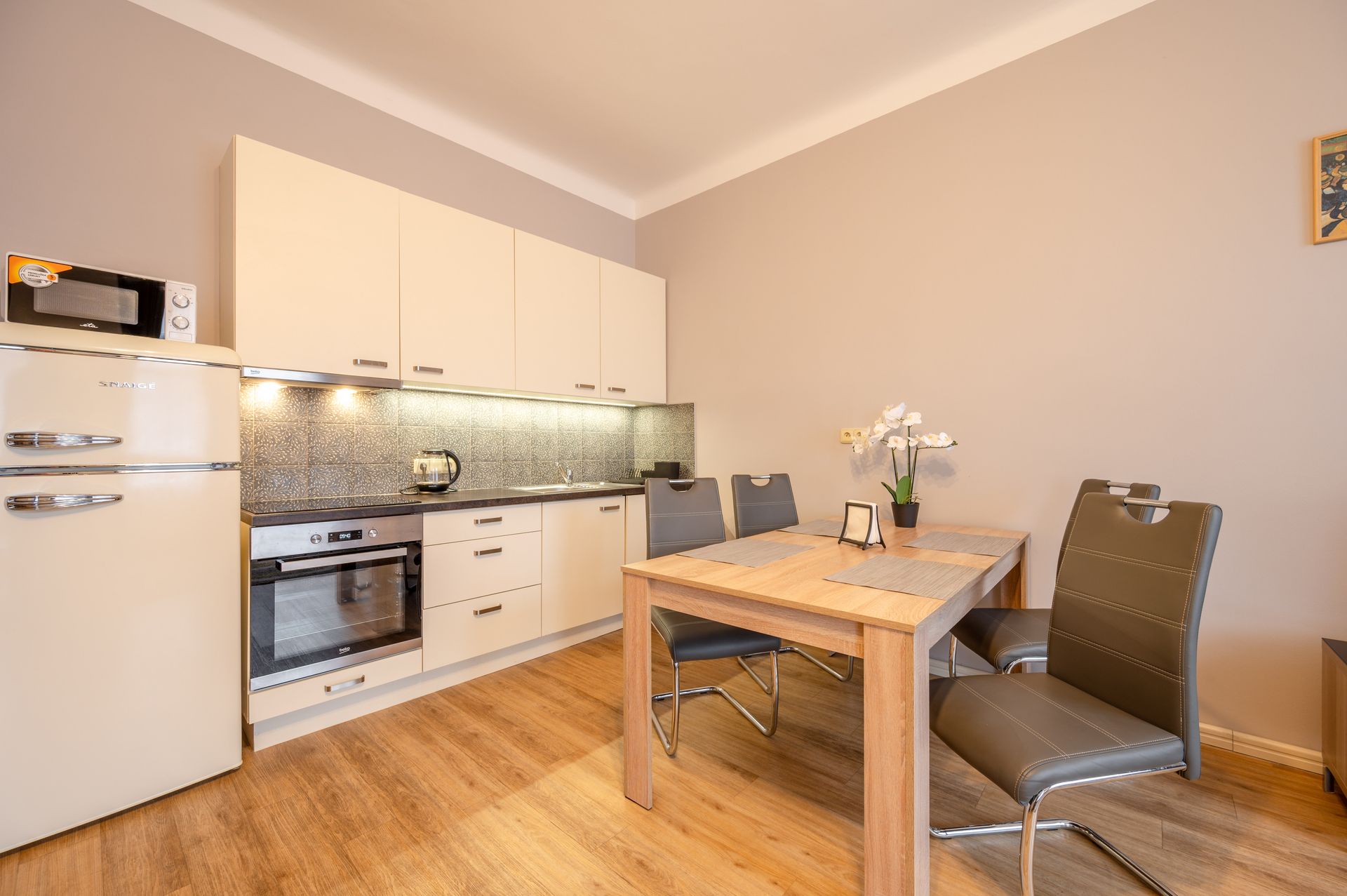Kuchyň: Kuchyňský kout, rychlovarná konvice, nádobí, trouba, mikrovlnka, myčka nádobí, lednice s mrazákem