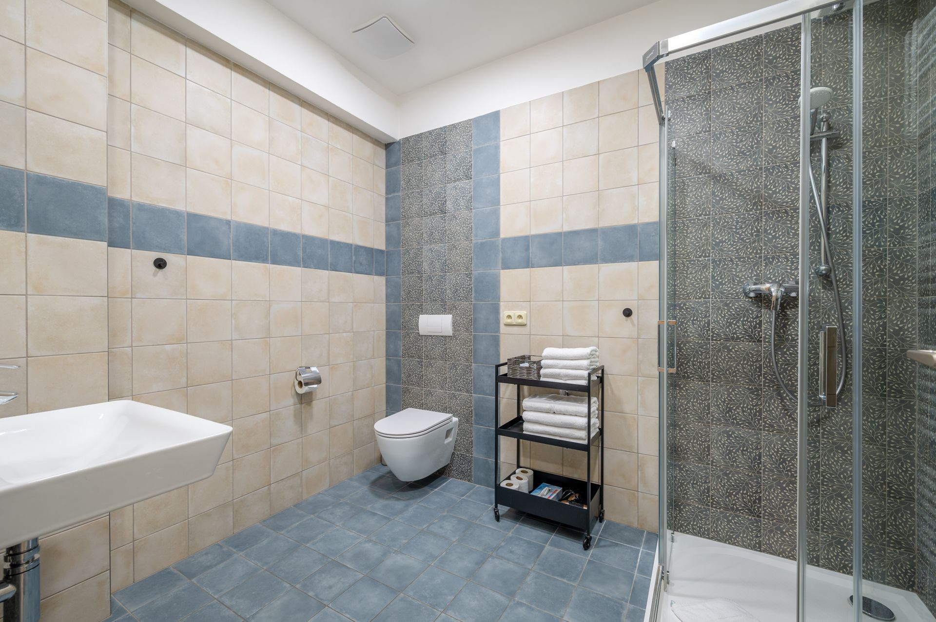 Vybavení koupelny: Sprchový kout, ručníky, šampón a sprchový gel, pračka